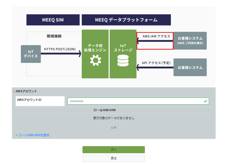 すでにAWSを利用中の方は、利用開始時にアカウントIDやユーザー/ロール ARNを入力することで、お客様のAWS環境からIoTデータストレージにアクセスできるようになります。