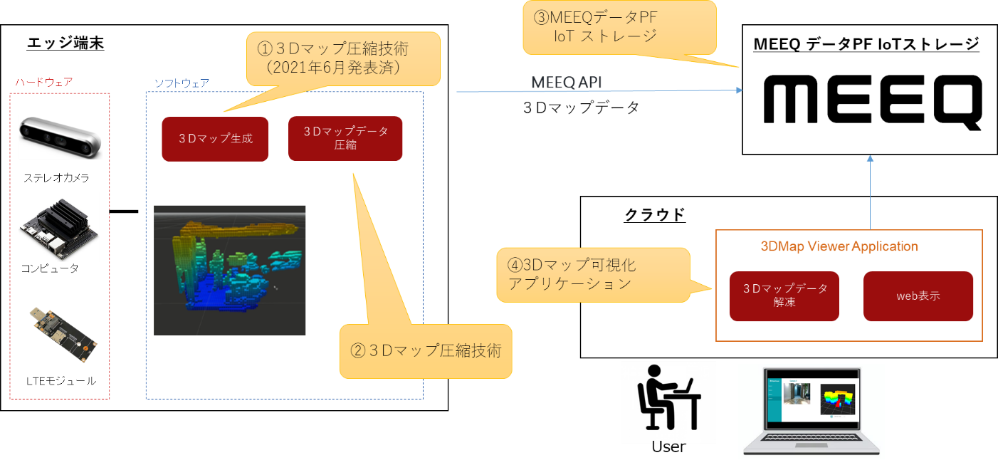 - 高圧縮ボクセル伝送技術:独自に開発した3Dマップ伝送のための圧縮技術により3Dマップを圧縮、非常に小さい帯域幅でモバイルネットワークを通してMEEQデータPF上に3Dマップを伝送