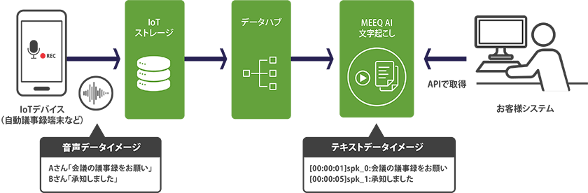 「MEEQ AI 文字起こし」は、IoTデバイスからMEEQ閉域ネットワークを経由して、IoTストレージに音声ファイルを送信することで、AI機能によりテキスト化されたデータを得られる機能※2です。お客様のIoTデバイス(録音機能とLTE等通信機能をもった)でMEEQ SIMを利用することで、セキュアな閉域網を経由したAI機能による「MEEQ AI文字起こし」が利用できます。テキスト化されたデータはAPI経由でも取得できますので、音声認識を応用したサービスを構築することが可能です。
