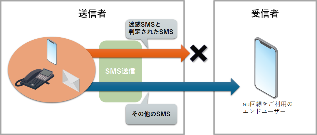 出会い系/ドラッグ/アダルト/ギャンブル/フィッシングなどの詐欺/マルウェア(不正な動作を行うよう、悪意を持って作られたソフトウェアなど)といったカテゴリに分類されるSMS(以下、迷惑SMS)の特徴を把握した上で、エンドユーザー宛に送信されたSMSの本文などの情報を参照し、迷惑SMSの特徴と合致するSMSがエンドユーザーに届かないようにする機能(以下、本機能)です。ただし、ごくまれにエンドユーザーにとって迷惑SMSでないSMSが規制される場合があります。