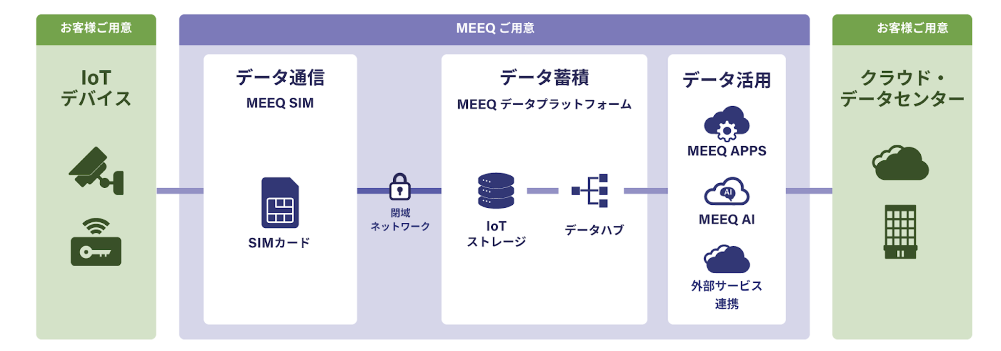 MEEQは、直感的なコンソール画面を通じて、簡単にIoT向け通信サービスを購入/決済/登録/管理ができるNoCode IoT/DX Platformです。NTTドコモ、ソフトバンク、KDDI回線のデータ通信専用SIMの利用が可能で、お客様側でシステムを用意しなくとも簡単にIoT回線を追加し、さまざまな事業をサポートすることができます。